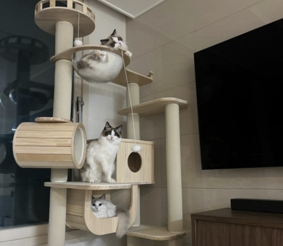 튼튼한 원목 기둥과 세련된 디자인 덕분에 인테리어에도 찰떡이고, 무엇보다 고양이가 스스로 올라타고, 쉬고, 숨고, 뛰노는 우주 공간 같은 구조라 너무 만족스러워요.