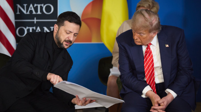 2025년 나토 정상회의에서 도널드 트럼프 미국 대통령과 볼로디미르 젤렌스키 우크라이나 대통령이 50분간 회담을 진행하며 대화 분위기가 전보다 훨씬 유화적으로 변했다. 전투복 대신 정장을 갖춰 입고 나온 젤렌스키의 외교적 자세 변화는 트럼프의 태도에도 영향을 미쳤다는 분석이 나온다.