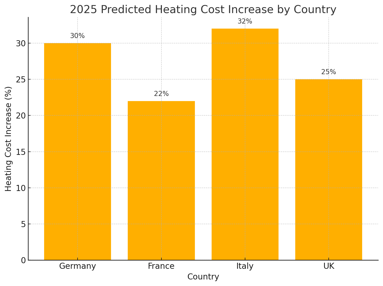 여기 보시는 그래프는 2025년 유럽 주요 국가(독일, 프랑스, 이탈리아, 영국)의 난방비 상승률을 예측한 것입니다.
